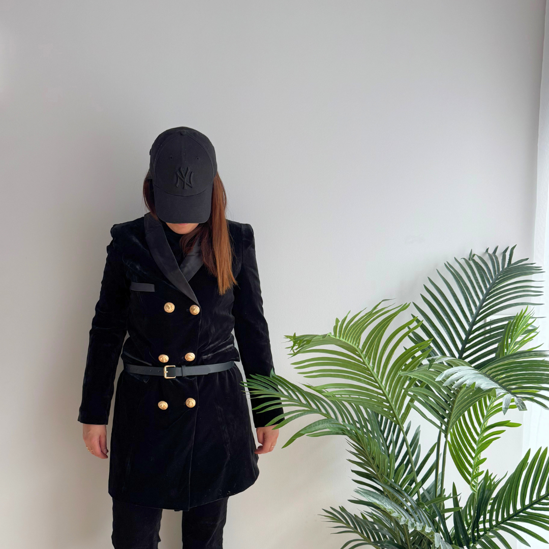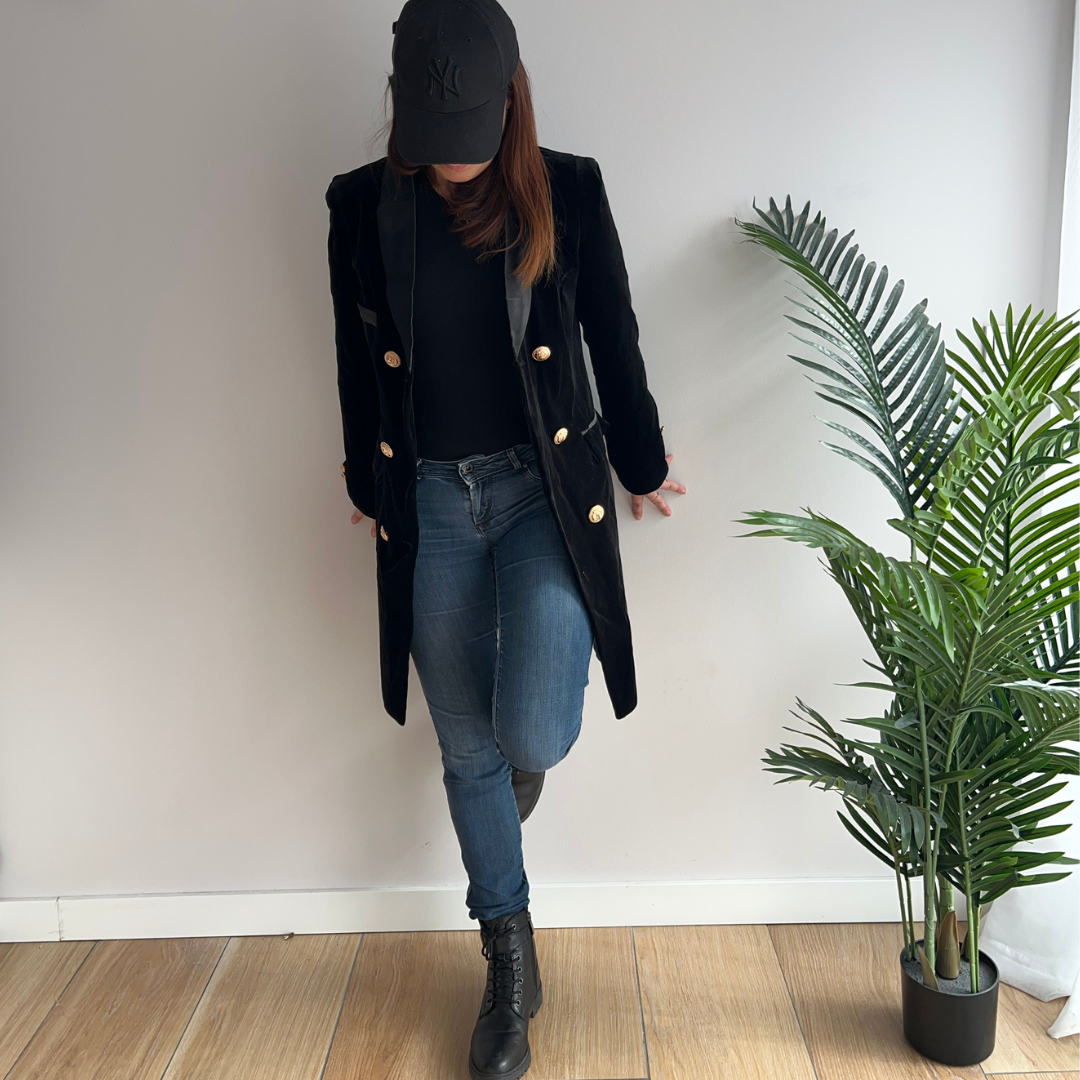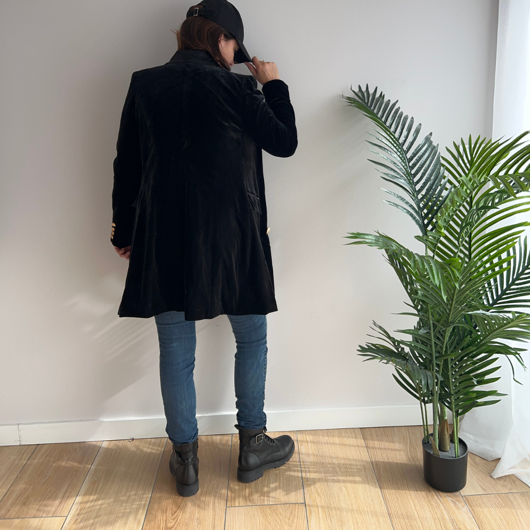 Manteau Femme en Velours Noir | Chic Intemporel & Double Boutonnage Doré