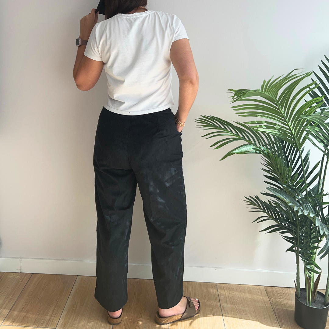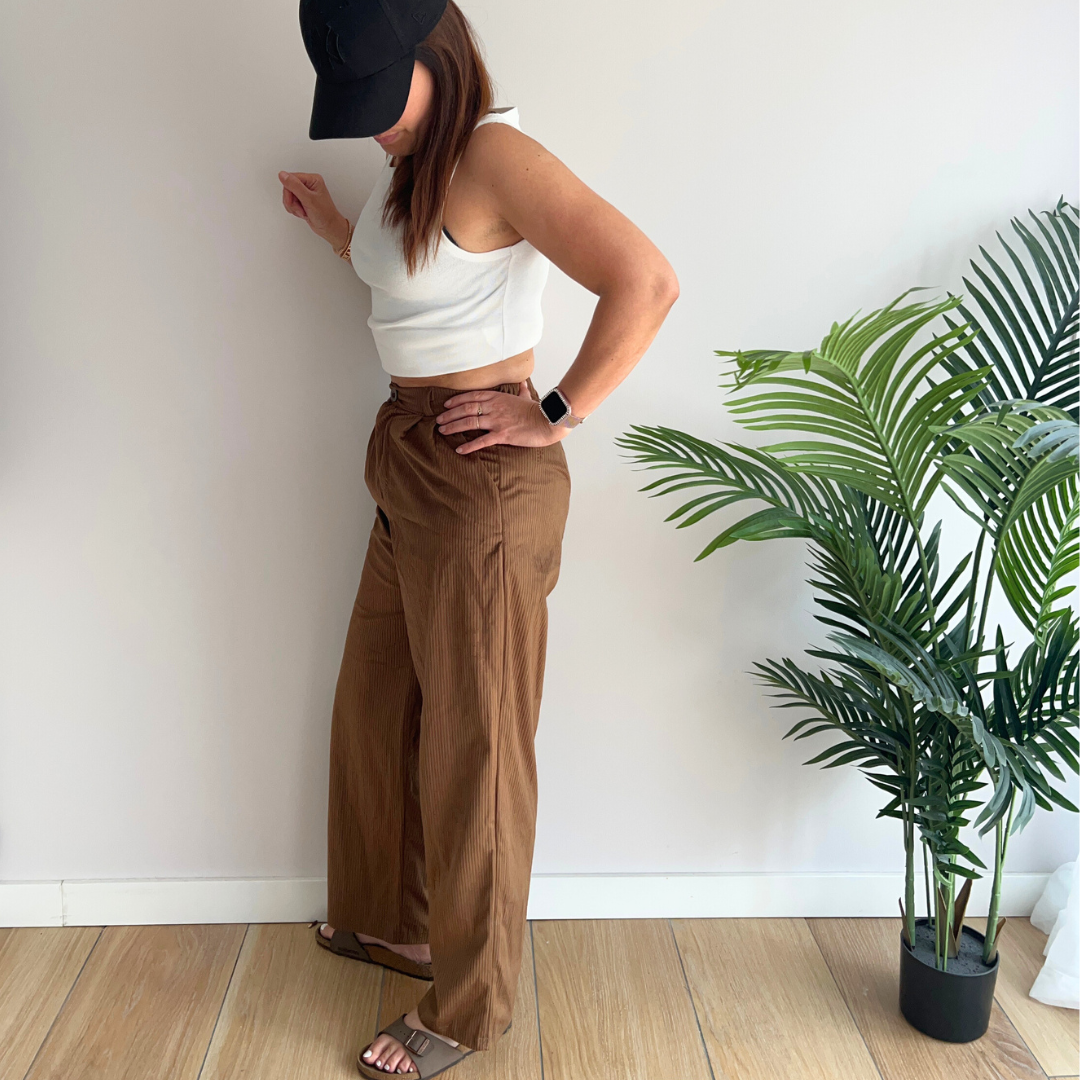 Redécouvrez l’essentiel printanier revisité avec élégance grâce à ce pantalon en velours côtelé léger à taille haute pour femme.